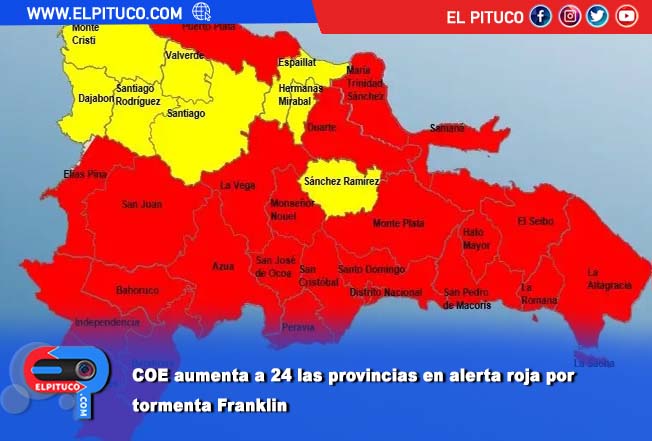 El Centro de Operaciones de Emergencias (COE) colocó 24 provincias en alerta roja y 08 en amarilla por posibles crecidas de ríos, arroyos y cañadas, así como inundaciones repentinas o urbanas, debido a que el centro de Franklin se ubica a unos 410 km al sur de Santo Domingo.