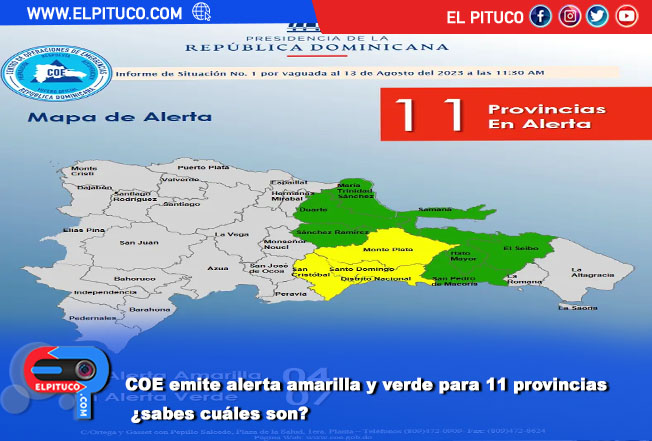 Las provincias en alerta amarilla son: Santo Domingo, Distrito Nacional, San Cristóbal y Monte Plata, mientras que en verde están: San Pedro de Macorís, Hato Mayor, maría Trinidad Sánchez, Samaná, Duarte, el Seibo y Juan Sánchez Ramírez.