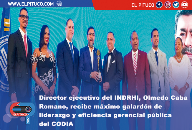 Santo Domingo .- El director ejecutivo del Instituto Nacional de Recursos Hidráulicos (INDRHI), Olmedo Caba Romano, recibió el Gran Galardón al Liderazgo y la Eficiencia Gerencial Pública, el más alto reconocimiento otorgado en el marco de la Semana Aniversario del Colegio Dominicano de Ingenieros, Arquitectos y Agrimensores (CODIA), con motivo de sus 63 años.