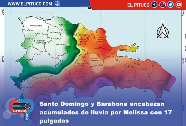Santo Domingo y Barahona encabezan acumulados de lluvia por Melissa con 17 pulgadas