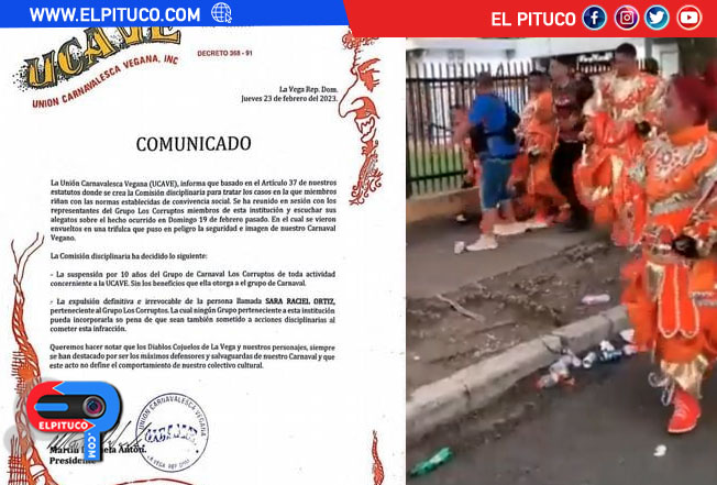 La Unión Carnavalesca Vegana (UCAVE) informó que suspendió por 10 años al grupo de carnaval “Los Corruptos” de toda actividad, tras el incidente registrado el pasado 19 de febrero en el que una mujer de la tropa agredió con un arma blanca a un señor, que disfrutaba del evento familiar.